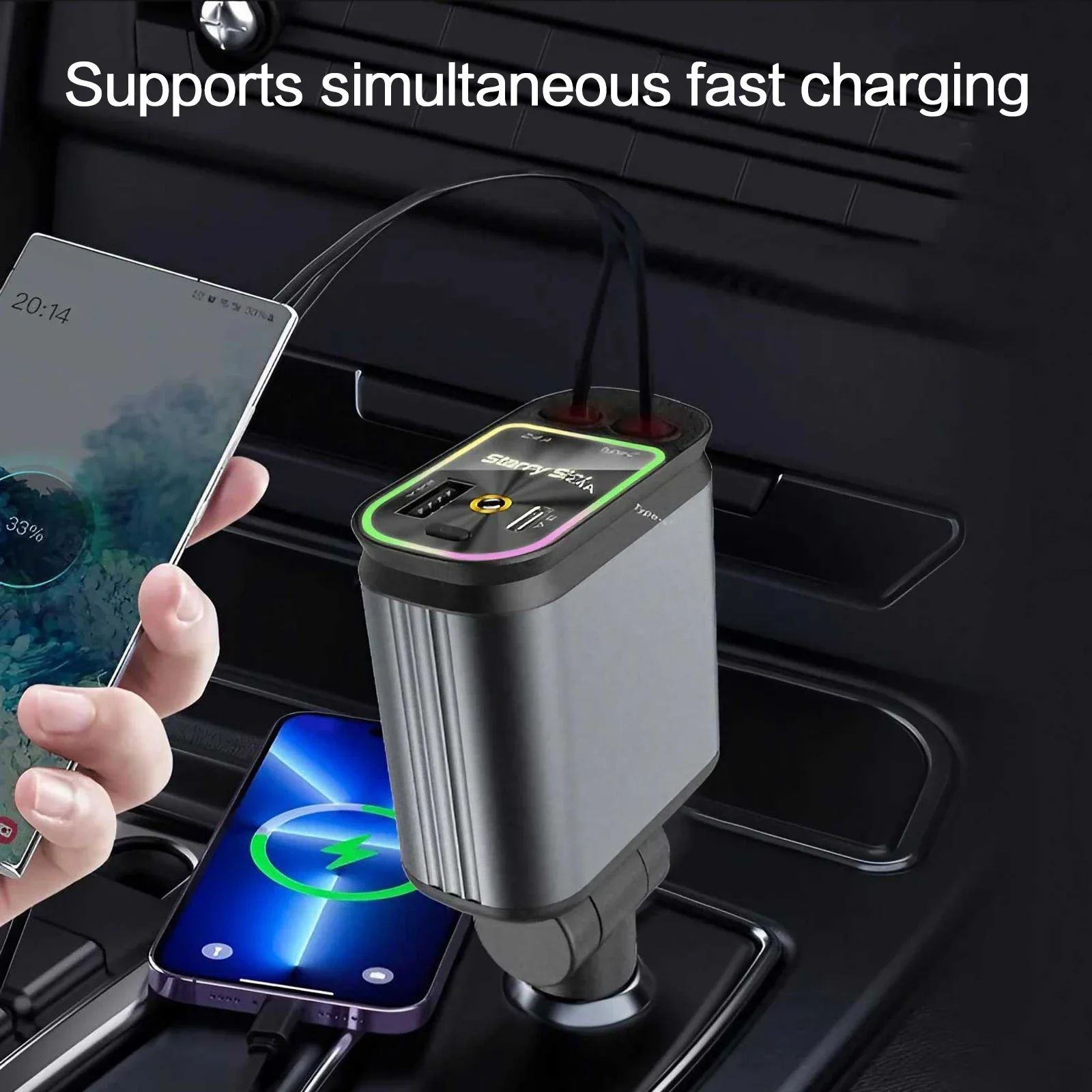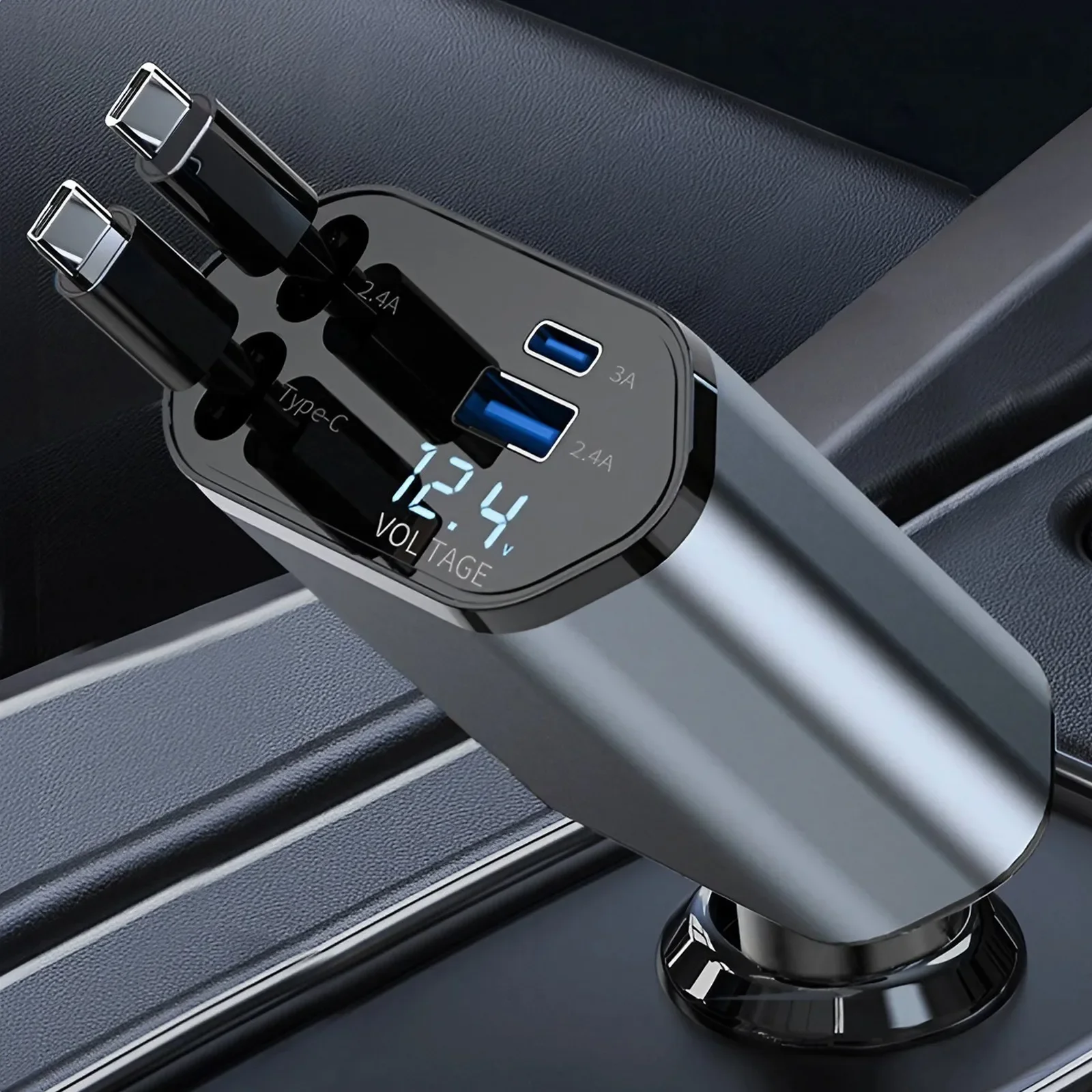 Upgraded 4-1 Fast Charging Solution: With a real PD30W type-C retractable cable, and additional USB-C and USB-A ports, this fast charge retractable car charger supports fast charging for up to 4 devices simultaneously. Say goodbye to the hassle of carrying multiple chargers for your different devices.